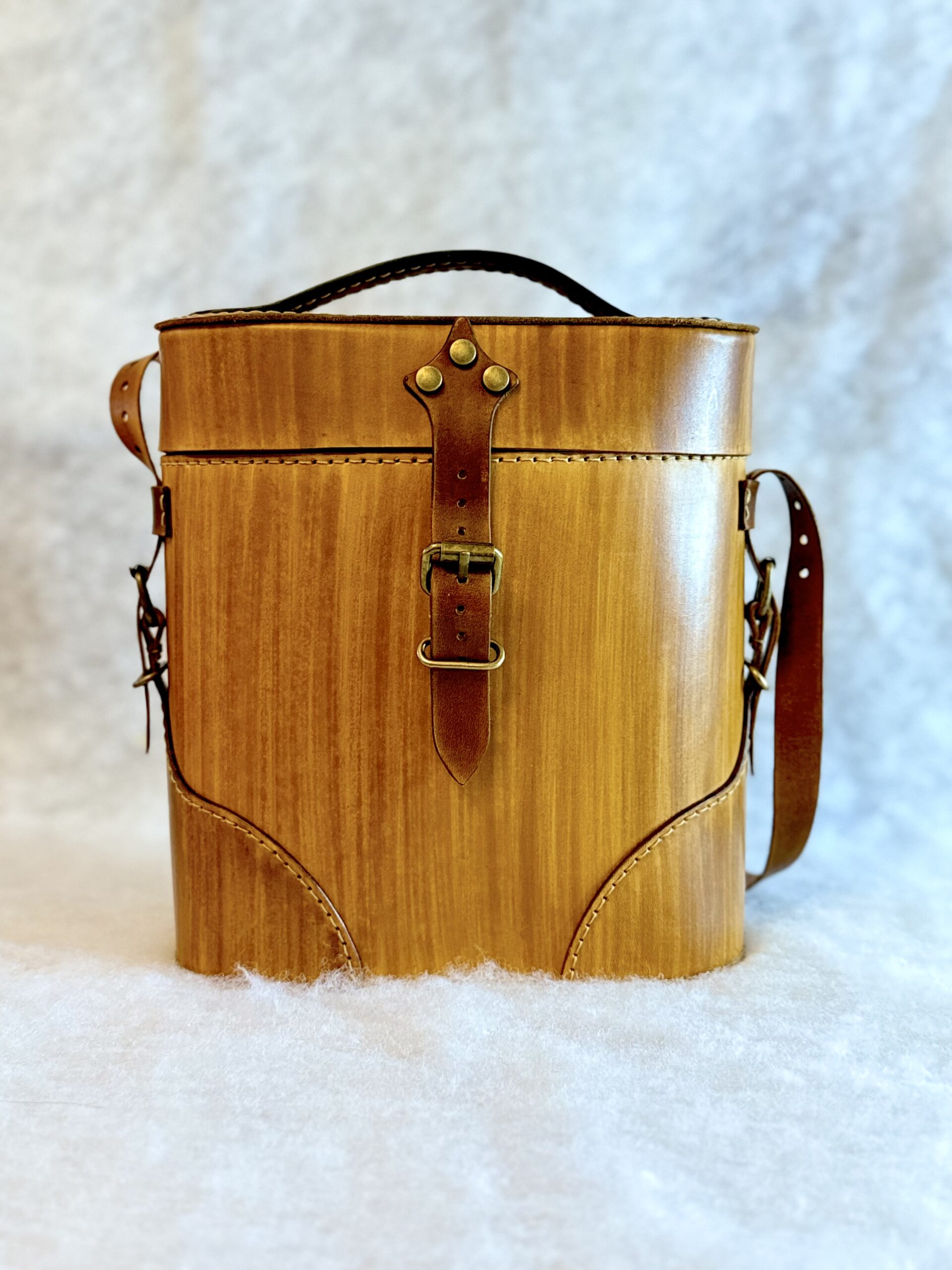 Cette lunch box en cuir à tannage végétal (et teinture maison effet bois) est une réinterprétation originale du sac à jumelles, pensée pour s’adapter à de multiples usages du quotidien (25 cm de hauteur pour une circonférence de 65 cm). À l’origine conçue pour transporter vos gamelles du midi, elle se révèle idéale pour la randonnée, les sorties en plein air ou comme sac à main original.