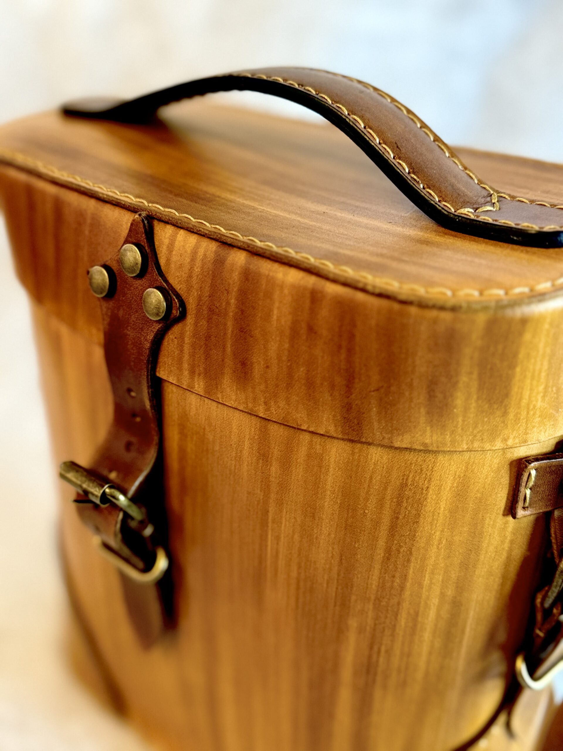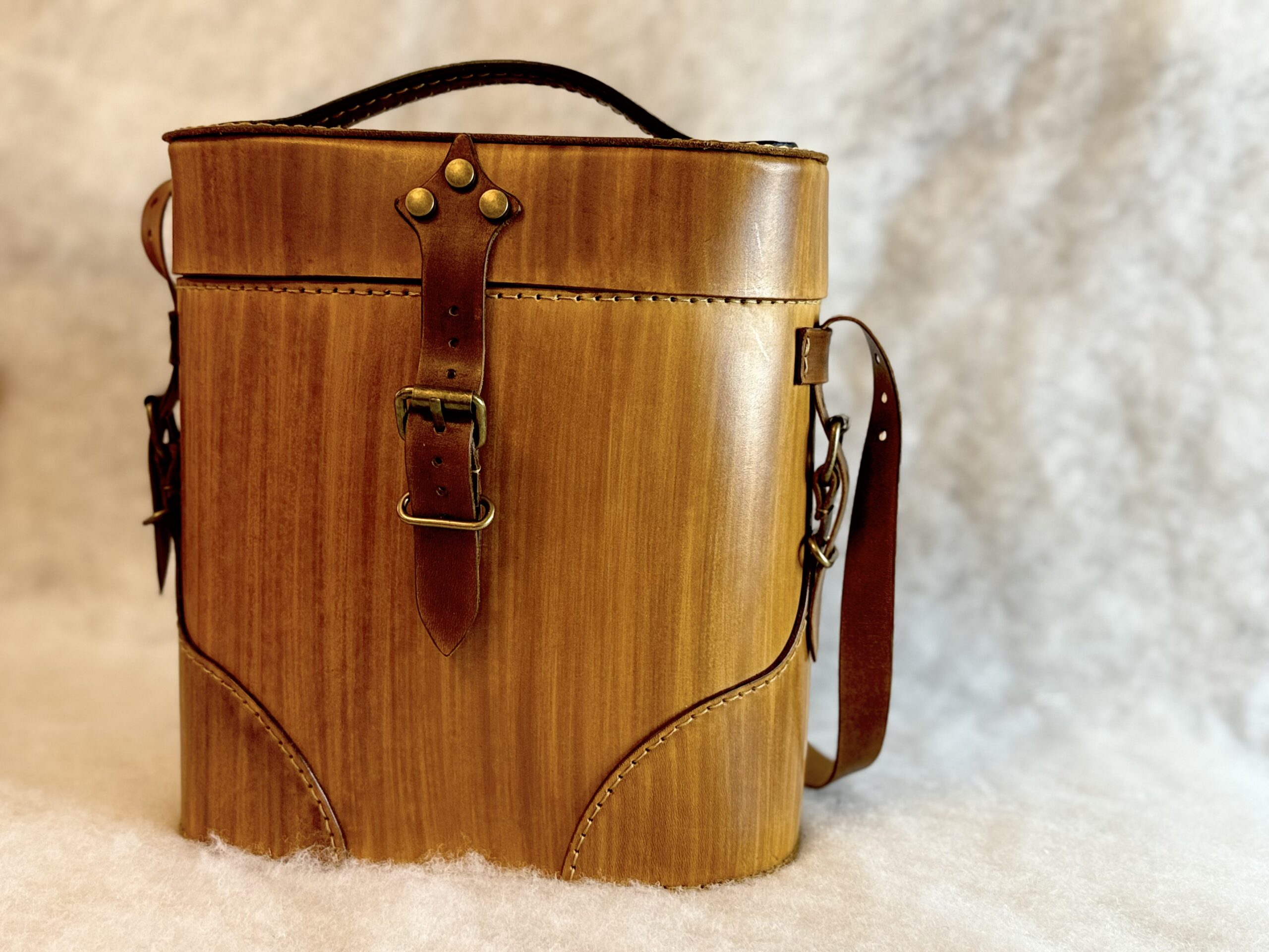 Lunch box en cuir à tannage végétal, inspirée du sac à jumelles. Teinture maison effet bois, idéale pour les repas nomades, la randonnée ou comme sac à main original.