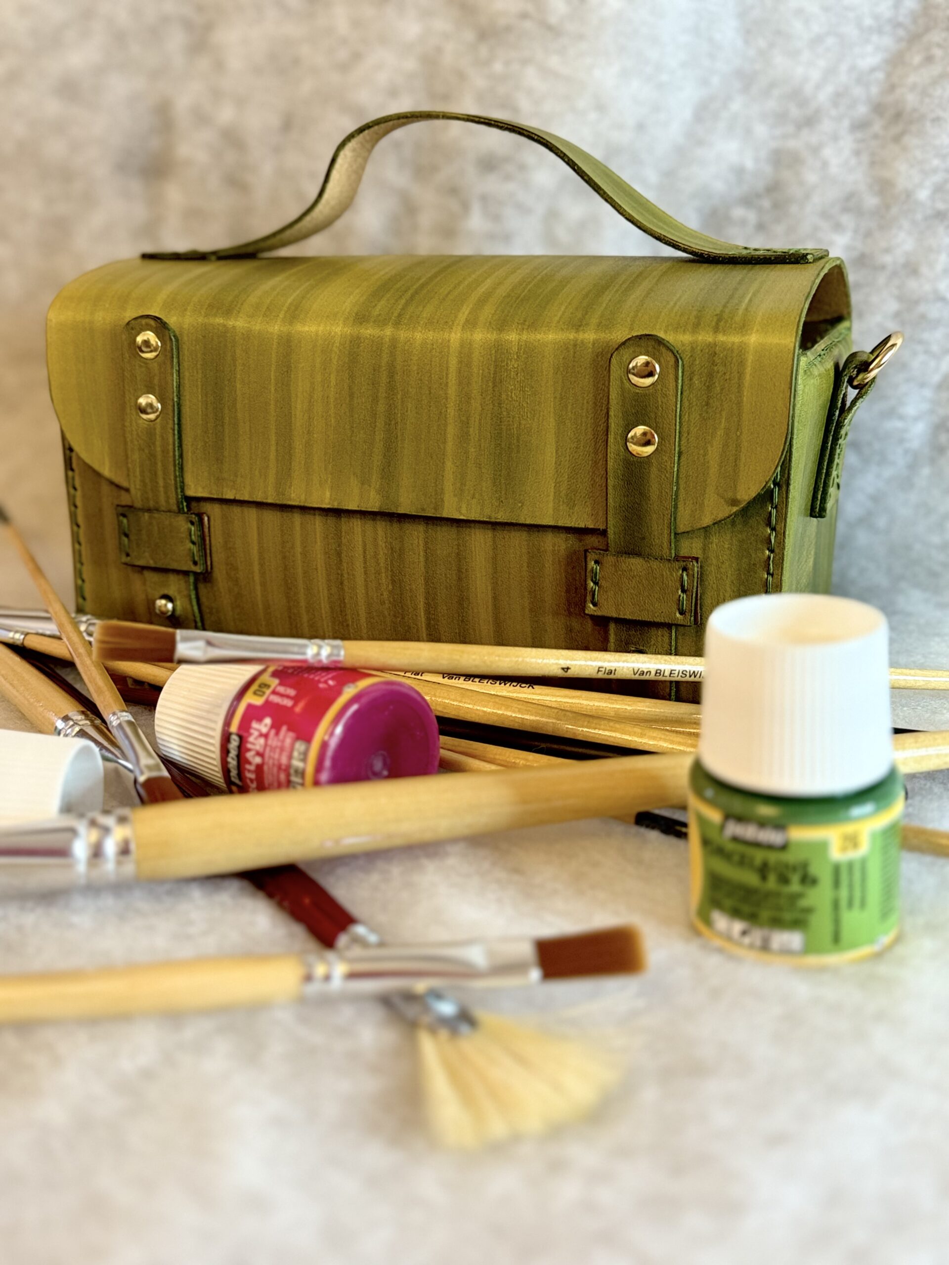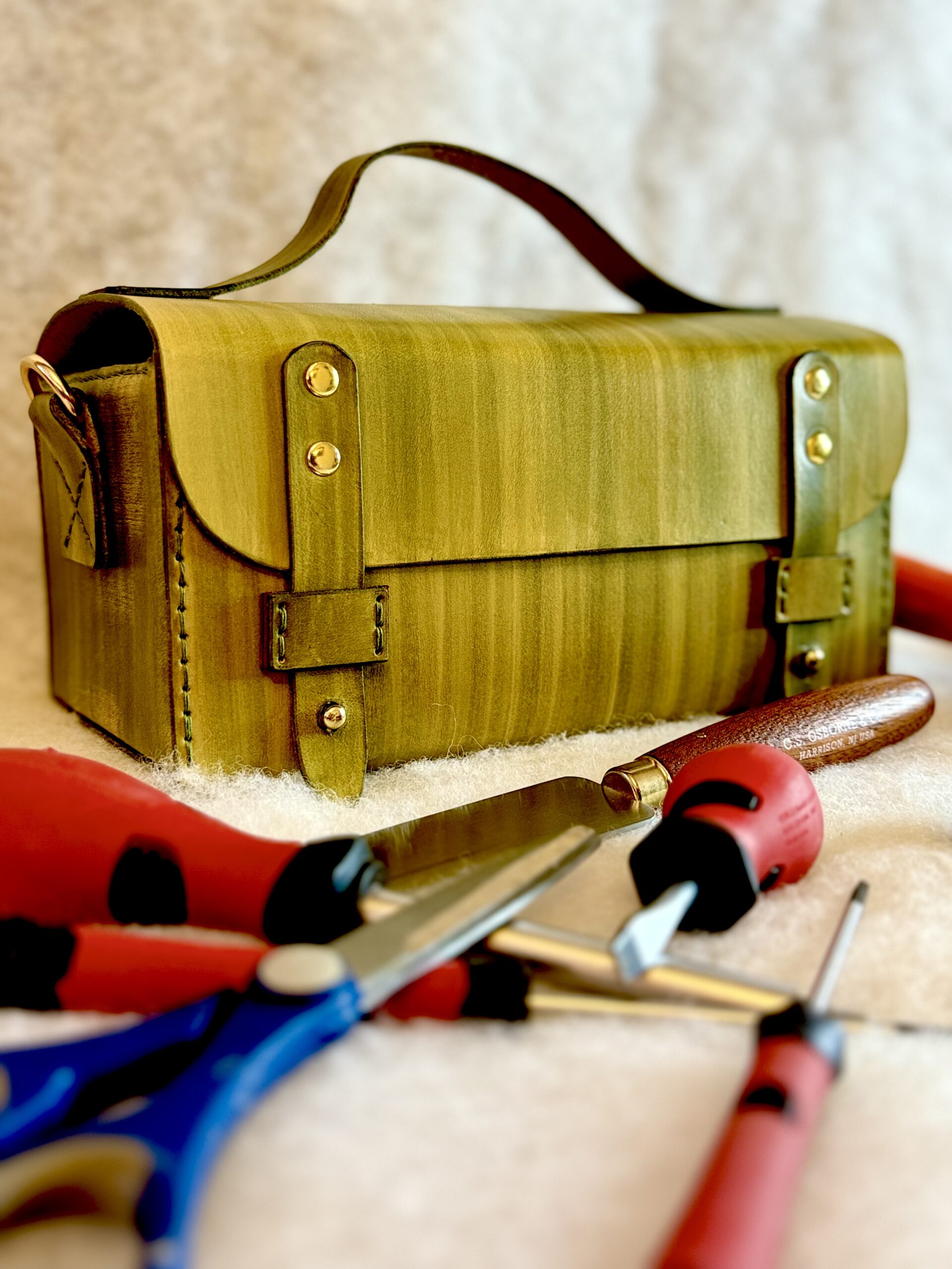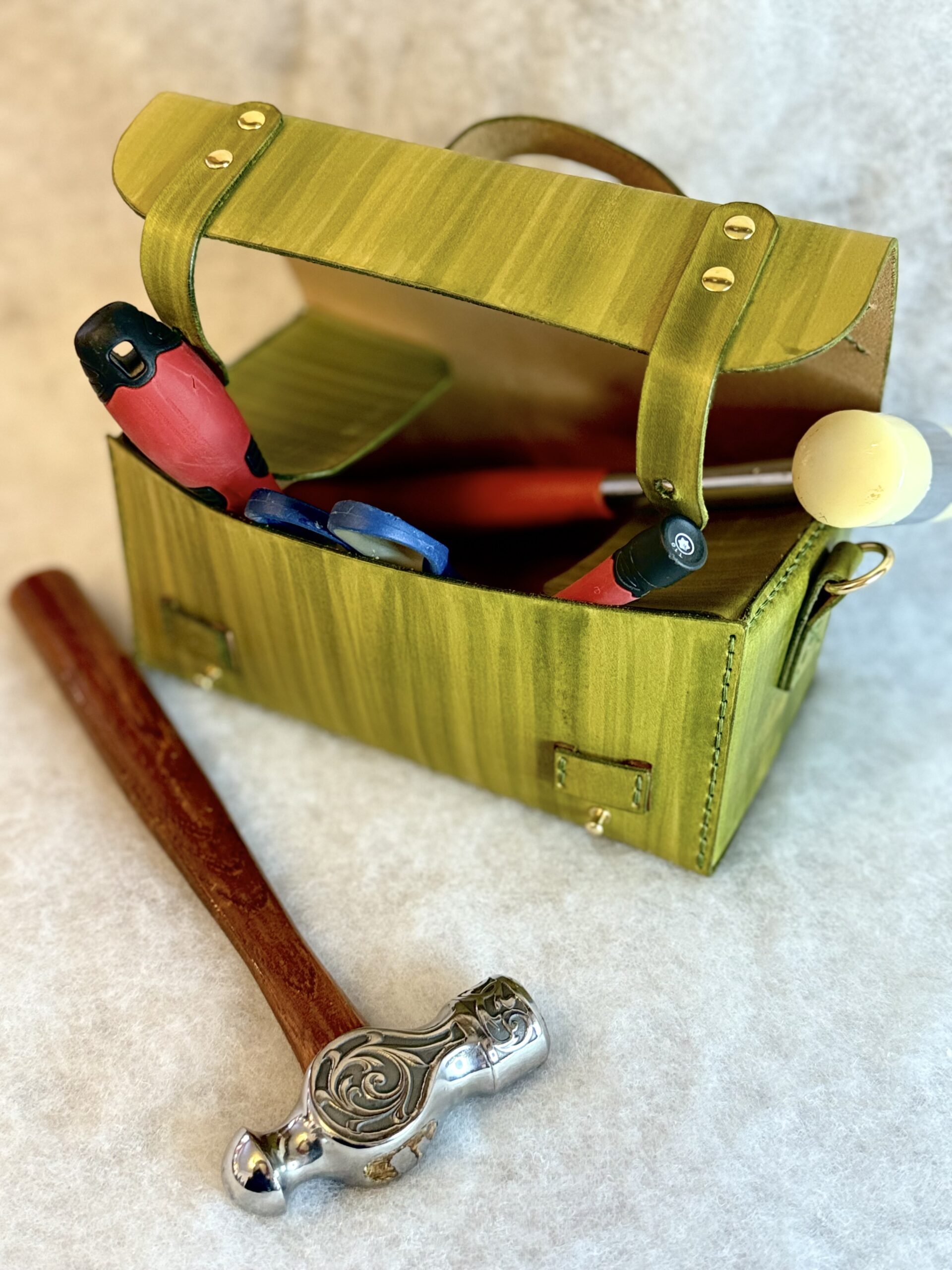 Polyvalente et robuste, cette mallette en cuir à tannage végétal teinte à la main, peut contenir vos outils de bricolage, mais peut aussi servir de trousse de maquillage, trousse de toilette ou même de coffre à peintures et pinceaux.  Pensée pour organiser et transporter votre matériel, avec un format compact mais fonctionnel l (23 × 12 × 12 cm), elle devient rapidement un indispensable du quotidien. Déclinée en effet végétal ou effet bois, selon les goûts.