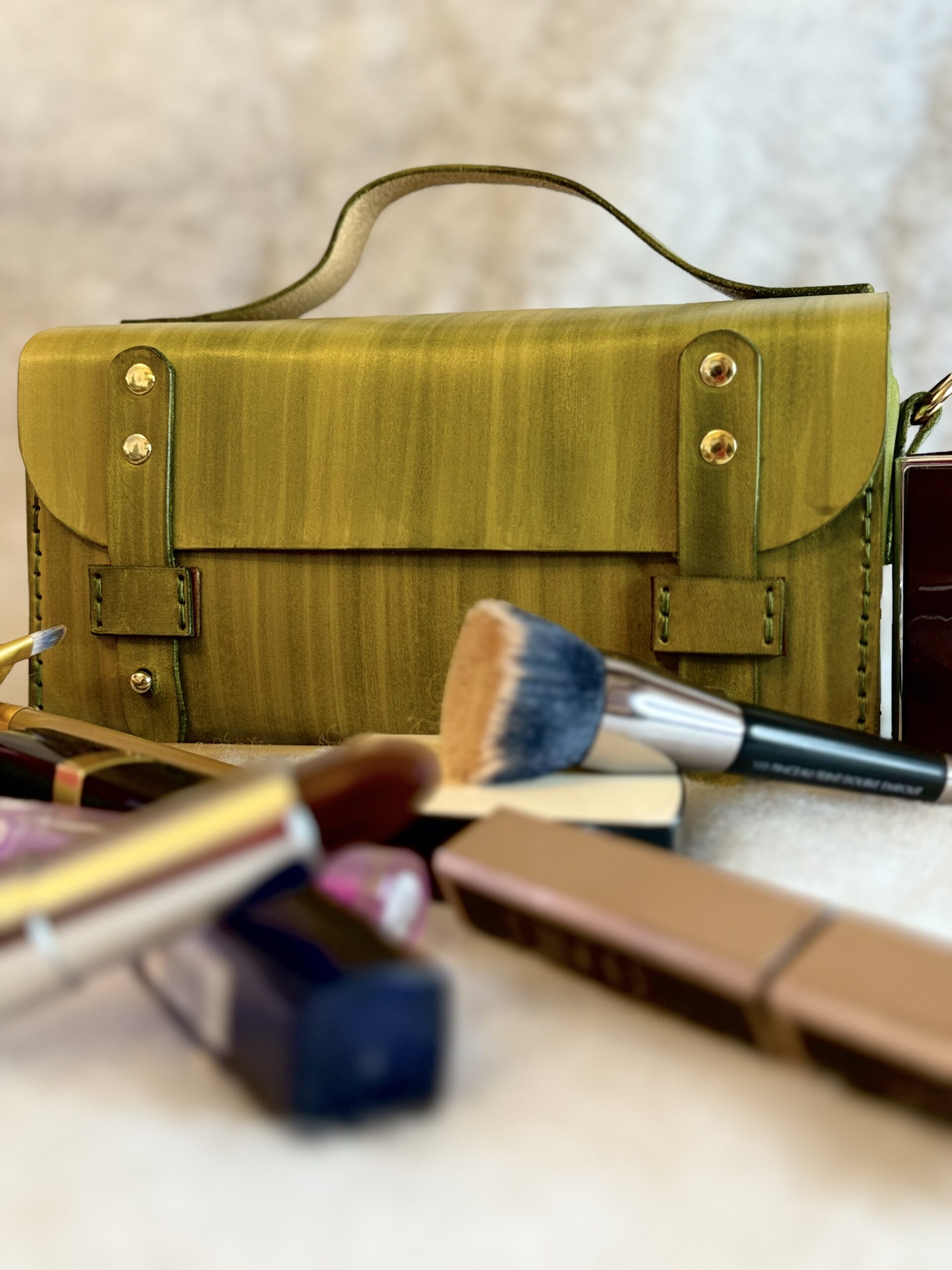 Mallette multifonction en cuir à tannage végétal, teintée à la main (effet végétal ou bois).