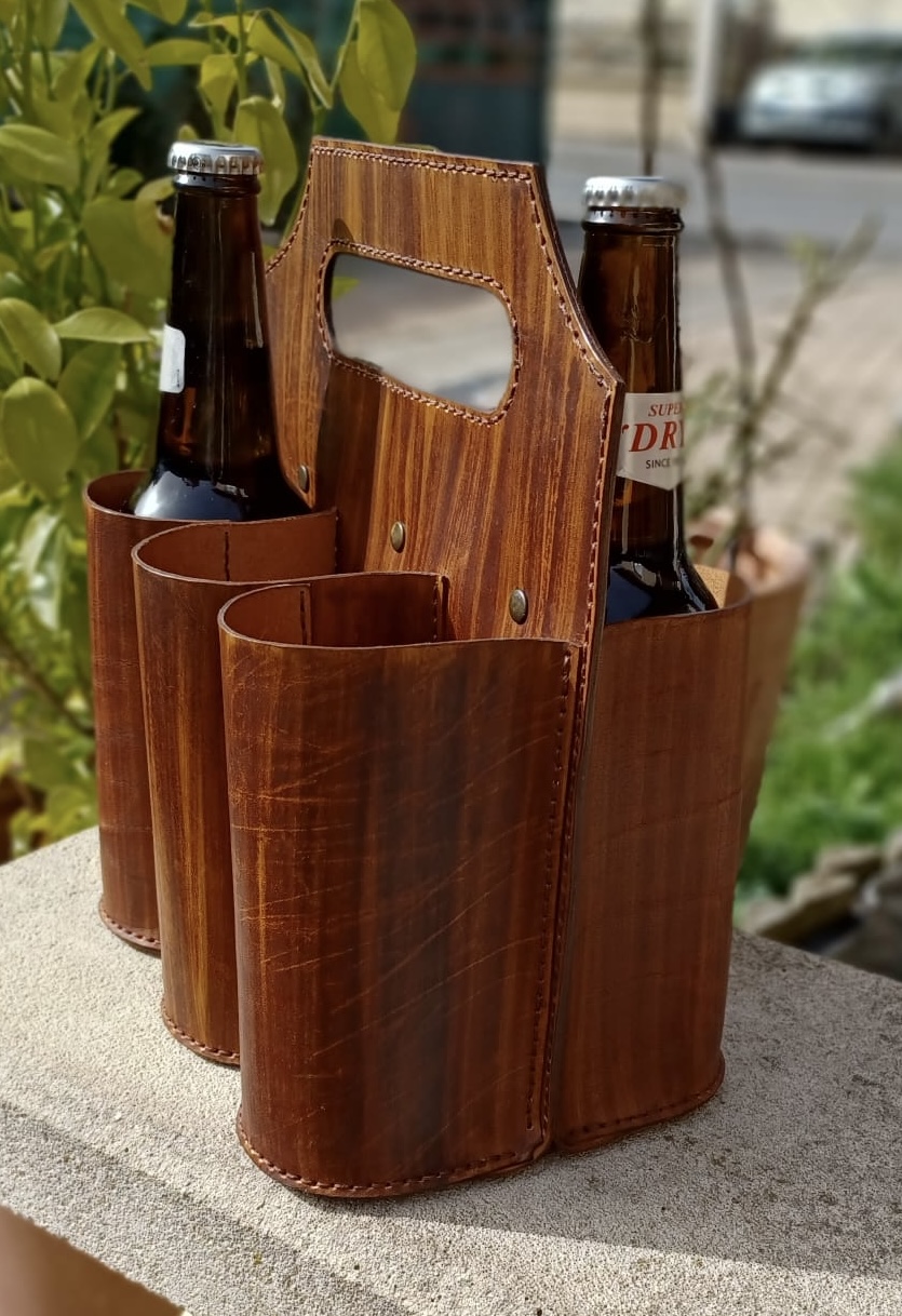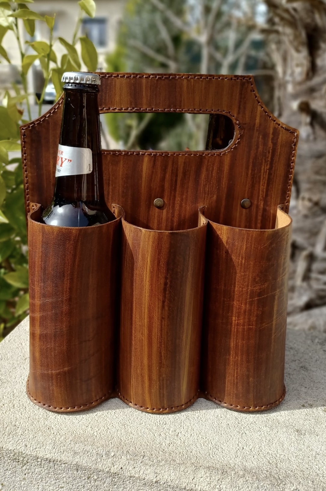 Plus besoin de prendre des cartons chez votre brasserie ou dans votre magasin du coin, pour faire votre stock de boissons. Avec ce porte-canettes / porte-bouteilles artisanal en cuir, vous pouvez faire le plein et transporter vos trouvailles houblonnées (ou sans alcool) pour chez vous, pour un pique-nique ou un barbecue. Grâce à sa robustesse, il peut contenir autant des canettes de 33cl ou 44cL que des bouteilles de 33cl ou 50cl.